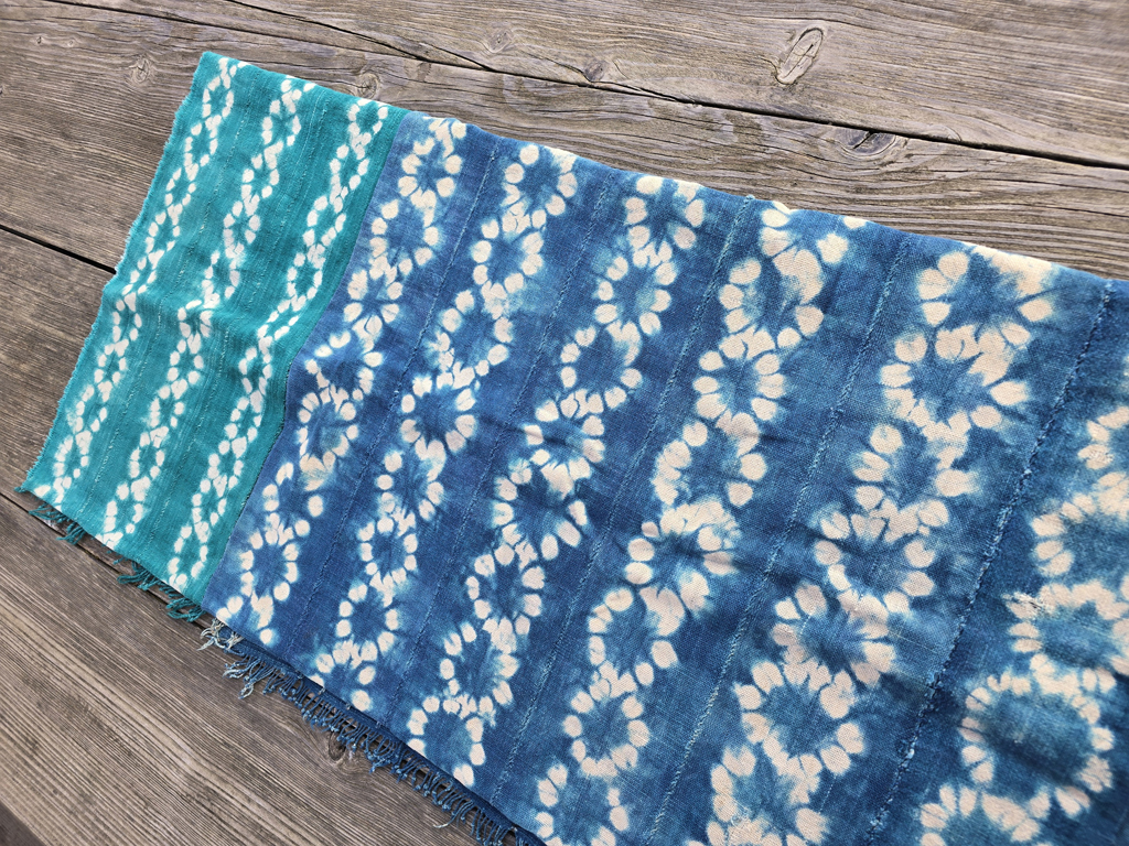 grossièrement structurées et tissées à la main, d’une largeur d’environ 10 à 15 centimètres, elles sont cousues ensembles. Traditionnellement, les bandes de coton sont tissées par les hommes.