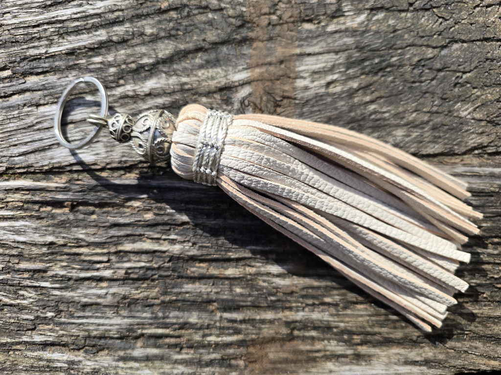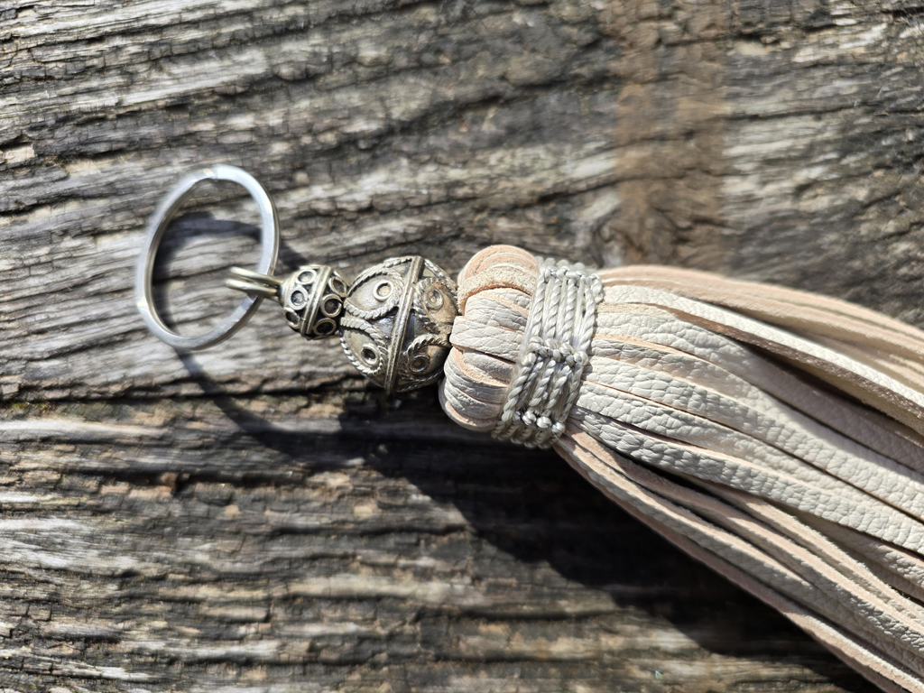 porte-clé cuir couleur nature boule en métal avec ornements mesures : env. 15 cm