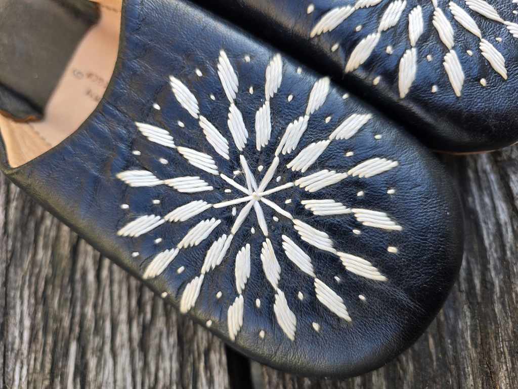 Leder schwarz, Stickerei écru