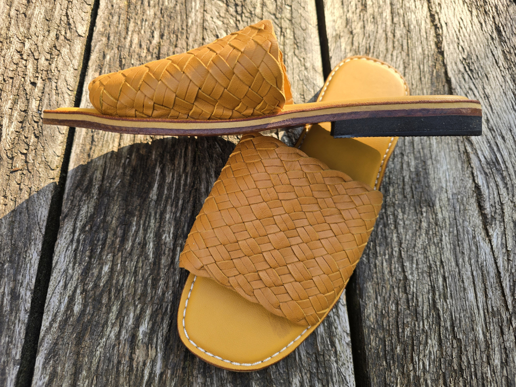 Grösse 37 Sandale mit leichtem Absatz Sohlenlänge ca. 24.5 / 25 cm Leder geflochten gelb handgearbeitet und genäht