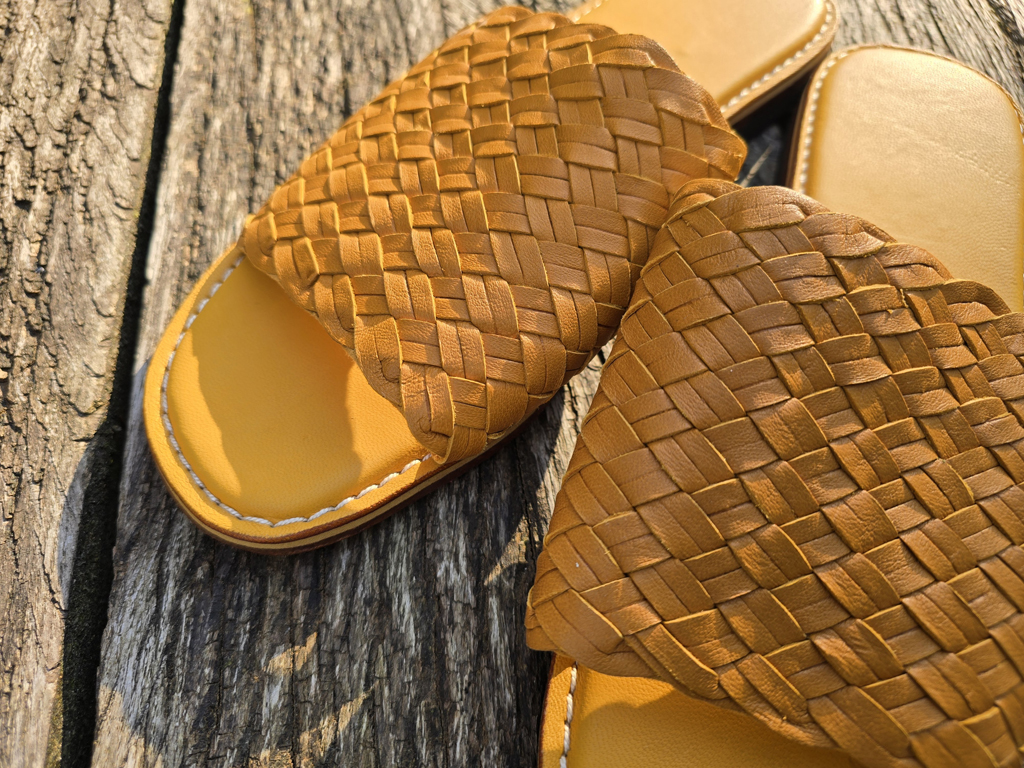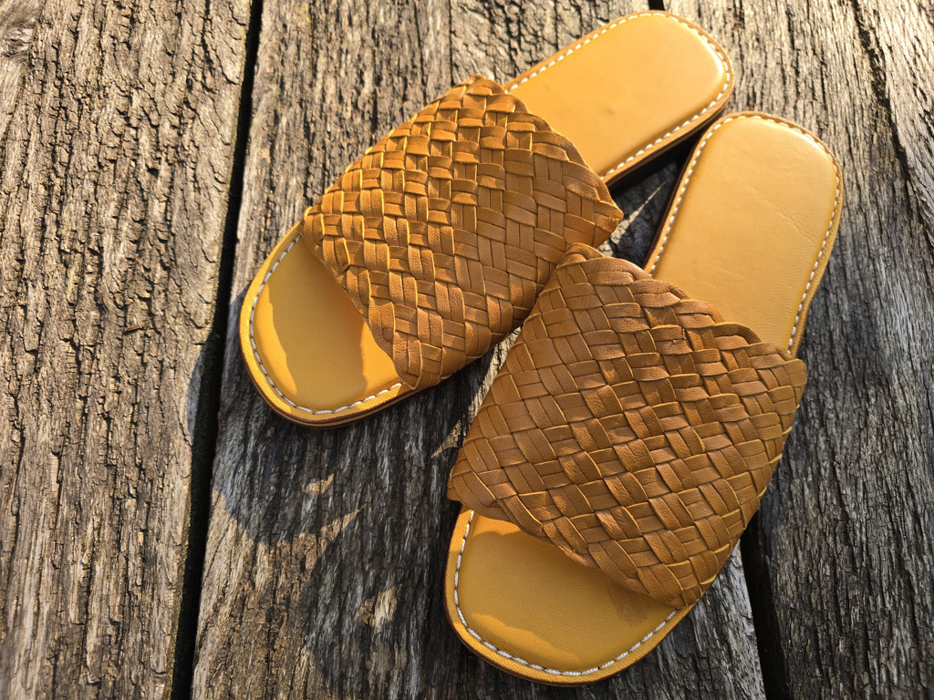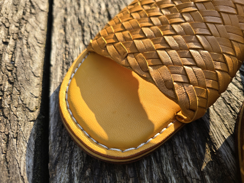 Grösse 40 Sandale mit leichtem Absatz Sohlenlänge ca. 26 / 26.5 cm Leder geflochten gelb handgearbeitet und genäht