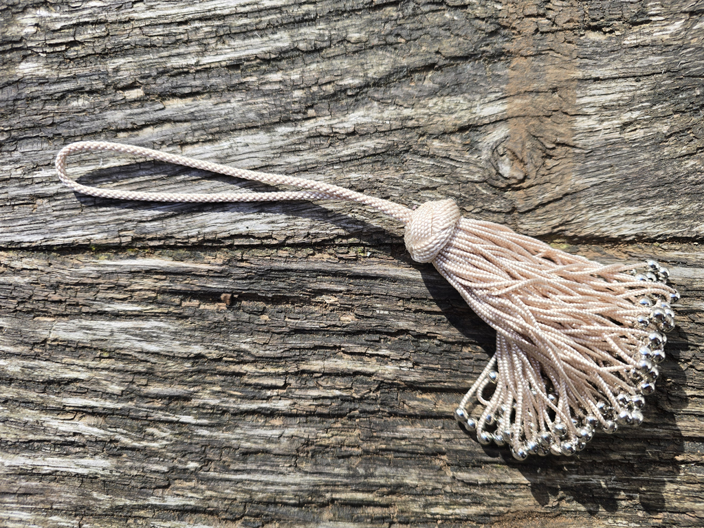 Viscose/Metallperlen Farbe beige/eierschale Länge Quaste 7 cm inkl. Quastenknopf Kordellänge ca. 9.5 – 10 cm