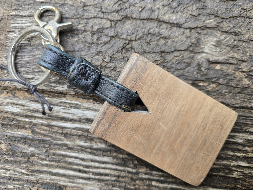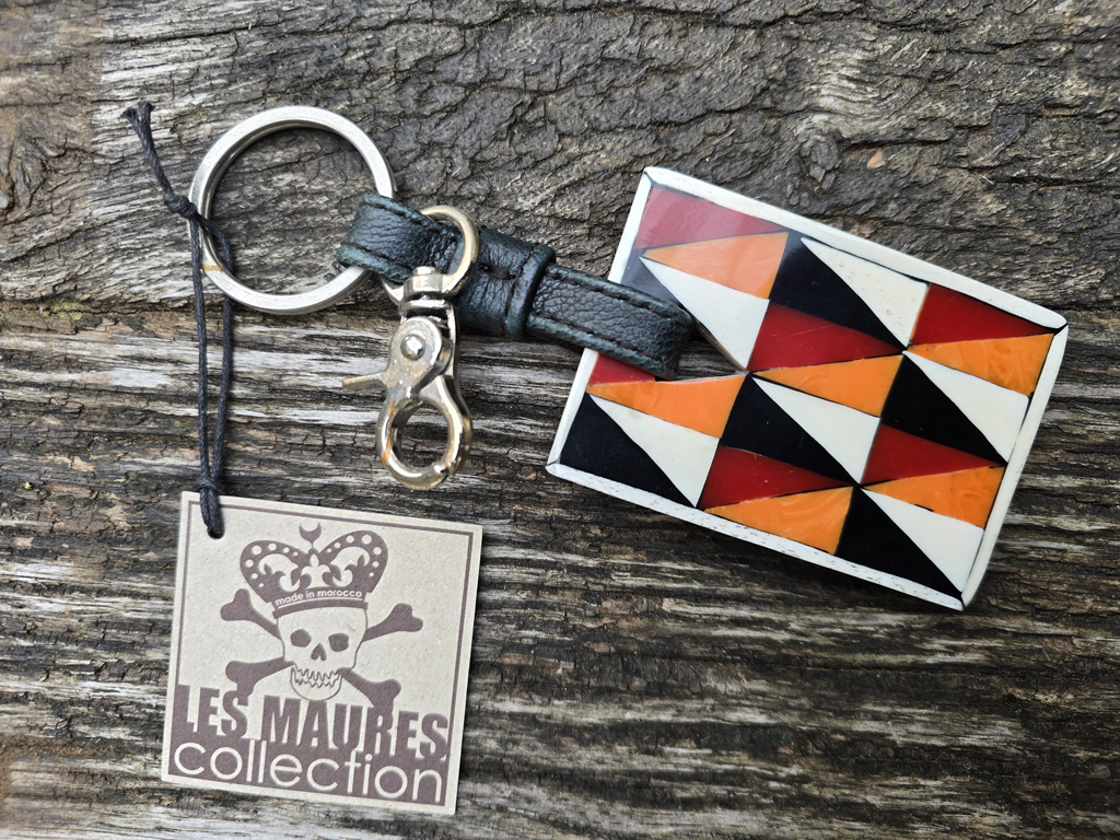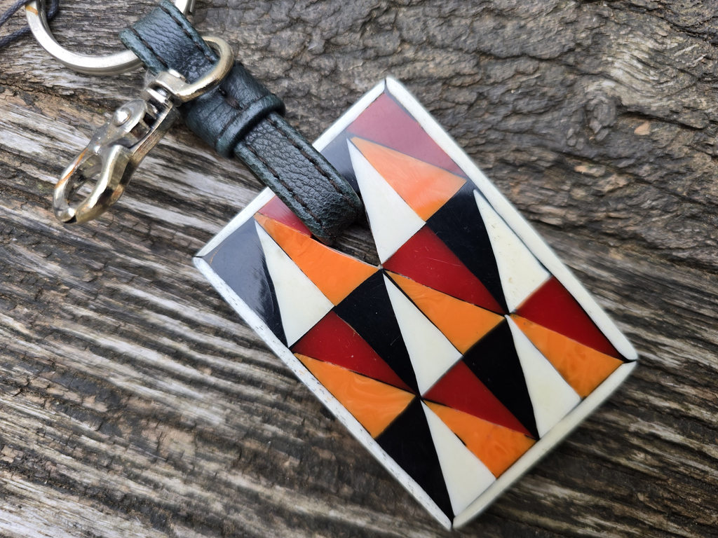 aus der Serie „LES MAURES COLLECTION“ Vorderseite Horn/eingefärbtes Harz orange Rückseite Nussbaum Leder Masse: ca. 7 x 5 cm